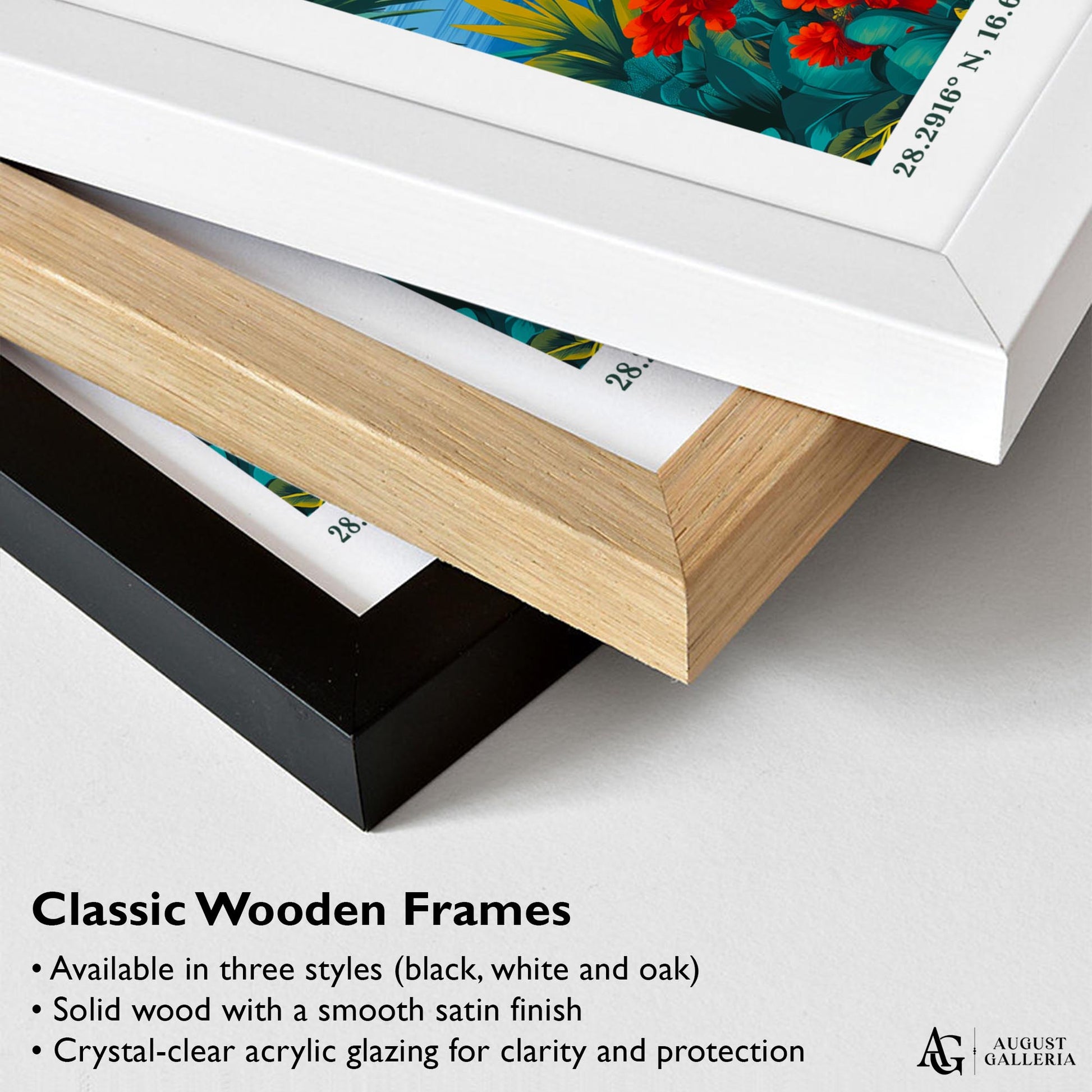 Made from sustainably sourced European wood and delivered ready to hang, available in black, white, or natural oak finishes. Includes a durable crystal-clear, shatter-resistant Perspex glaze for lasting protection and a sleek, modern look.
