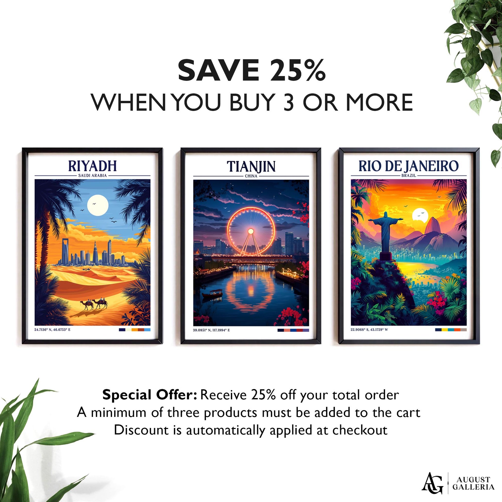 Celebrate the dynamic skyline of Tianjin with this retro travel illustration, featuring its blend of modern skyscrapers and historic European-style architecture along the Haihe River. Graceful bridges span the water, while the cityscape reflects in the calm river below under a bright sky. This print captures the unique character, cultural richness, and vibrant energy of Tianjin, making it a perfect keepsake for admirers of one of China’s most fascinating cities.