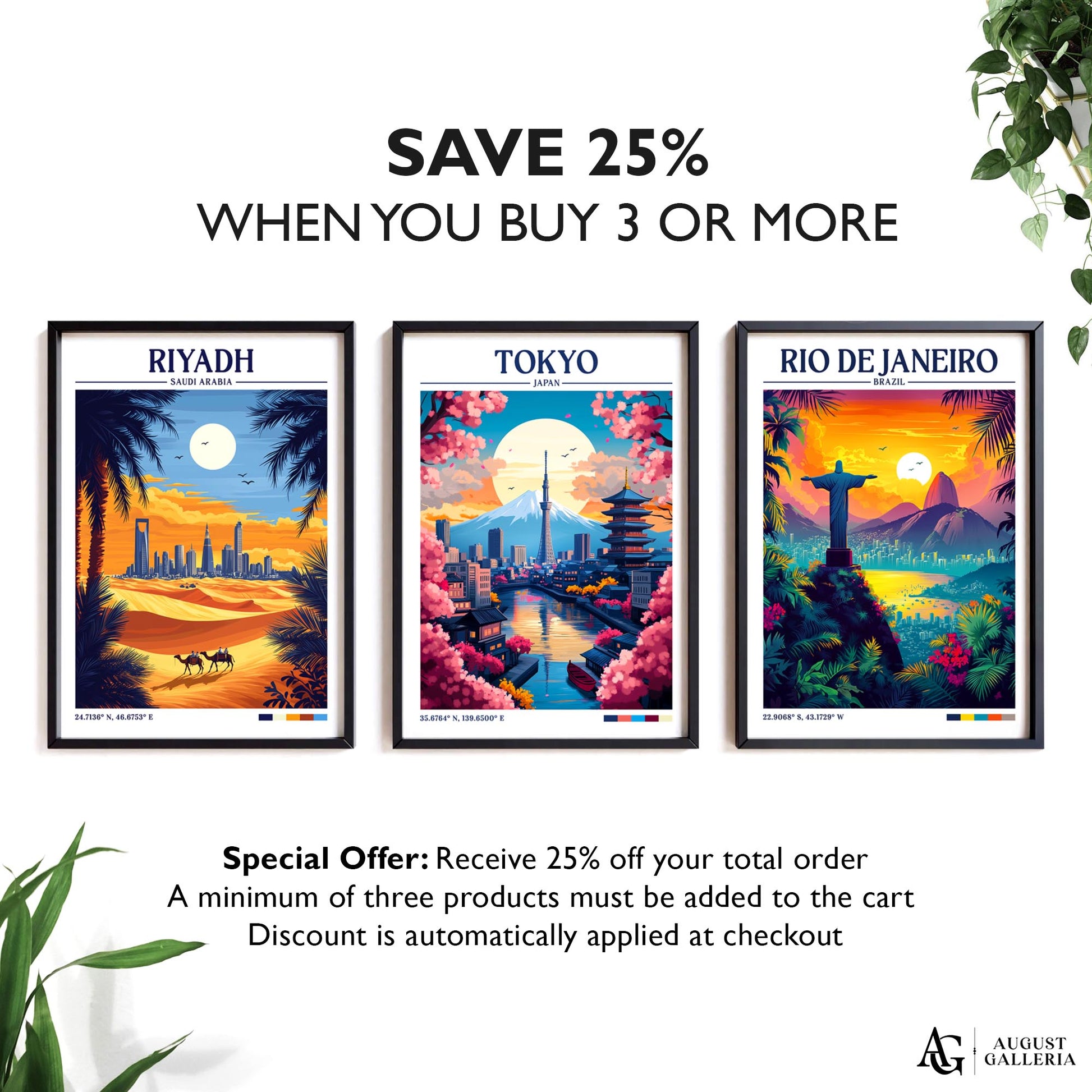 Celebrate the iconic skyline of Tokyo with this retro travel illustration, centred on the soaring Skytree Tower framed by delicate cherry blossoms in full bloom. Modern skyscrapers and traditional rooftops stretch across the city beneath a clear sky, creating a harmonious blend of contemporary and classic Japan. This print captures the vibrant energy, cultural beauty, and timeless charm of Tokyo, making it a perfect keepsake for admirers of the city.