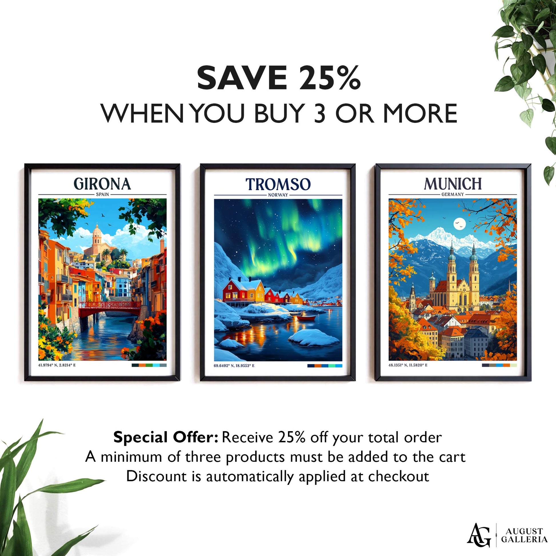 Celebrate the Arctic wonder of Tromsø with this retro travel illustration, featuring the city’s colourful waterfront buildings beneath a sky alive with the northern lights. Snow-capped mountains rise in the background, and the calm fjord waters reflect the vibrant aurora above. This print captures the magical atmosphere, natural splendor, and timeless charm of Tromsø, making it a perfect keepsake for admirers of Norway’s northern landscapes.