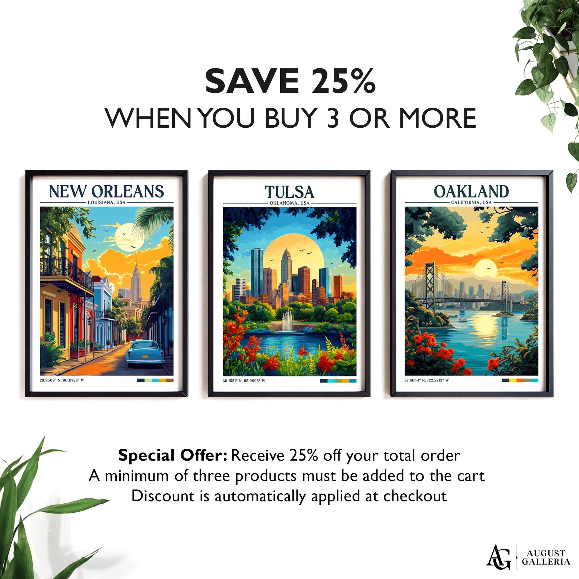 Celebrate the vibrant spirit of Tulsa with this retro travel illustration, featuring the city’s distinctive skyline set against a bright sky. Modern skyscrapers rise alongside historic Art Deco buildings, reflecting the city’s rich architectural heritage and dynamic energy. This print captures the timeless charm, cultural richness, and urban character of Tulsa, making it a perfect keepsake for admirers of Oklahoma’s thriving cityscape.