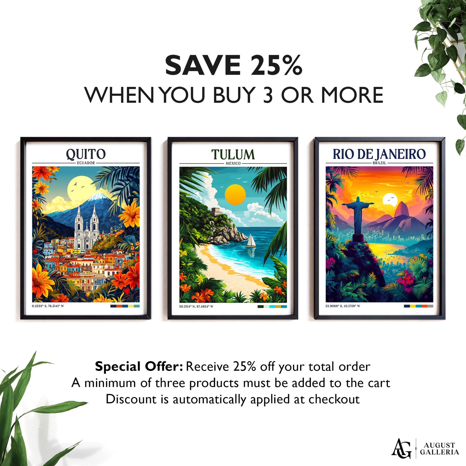 Escape to the tropical paradise of Tulum with this retro travel illustration, featuring its pristine white sandy beaches and turquoise waters. Lush palm trees frame the scene, while gentle waves lap the shore under a bright, cloudless sky. This print captures the serene coastal beauty, vibrant tropical atmosphere, and timeless charm of Tulum, making it a perfect keepsake for lovers of Mexico’s Riviera Maya.