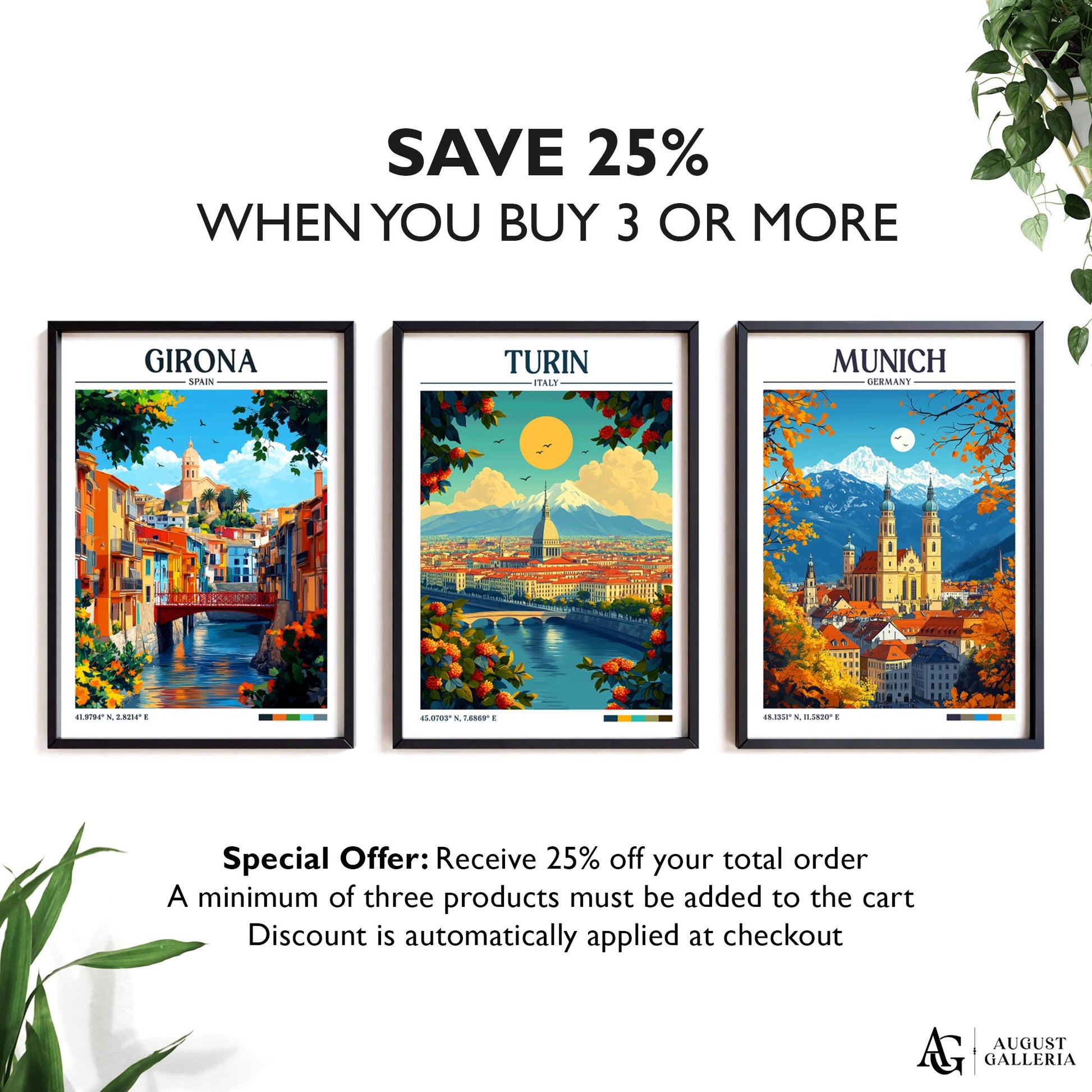 Celebrate the elegance of Turin with this retro travel illustration, featuring the city’s historic architecture, grand squares, and classic rooftops stretching beneath a bright sky. The surrounding Alps provide a majestic backdrop, highlighting the city’s blend of cultural heritage and scenic beauty. This print captures the timeless charm, architectural splendor, and refined atmosphere of Turin, making it a perfect keepsake for admirers of northern Italy.