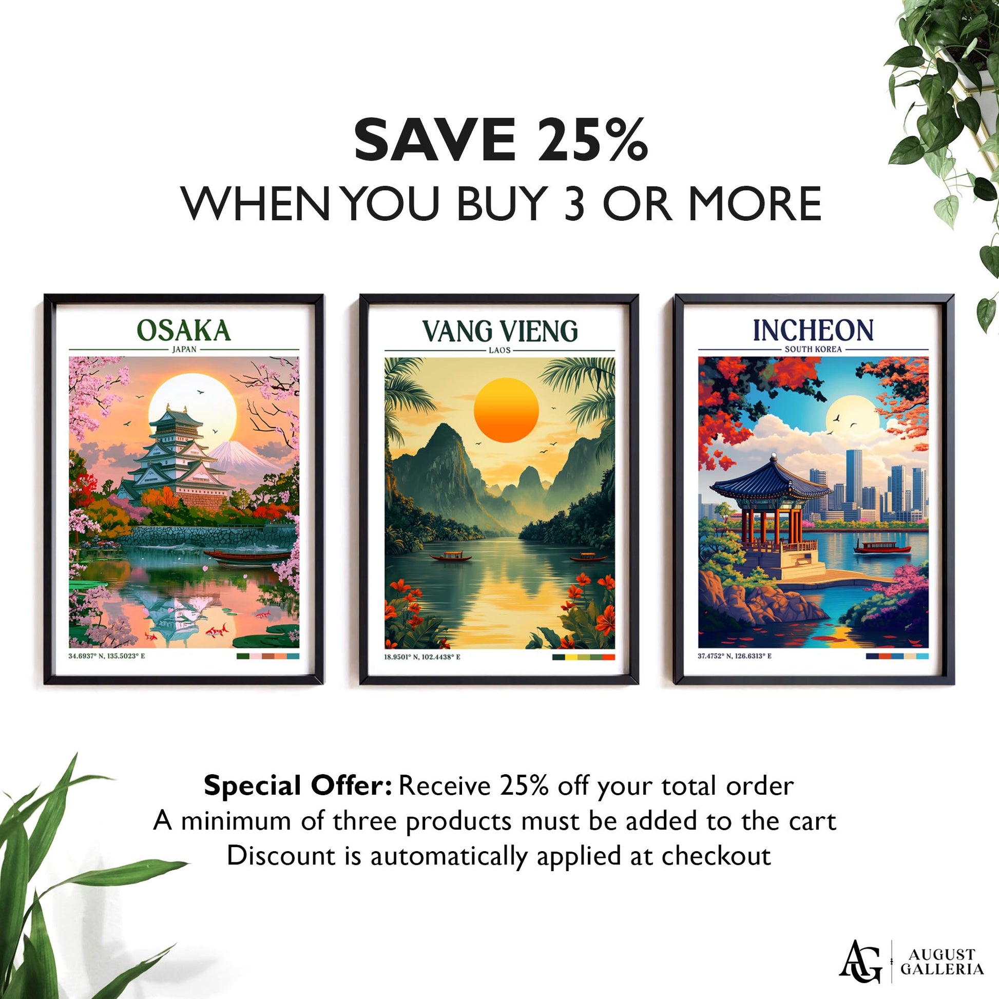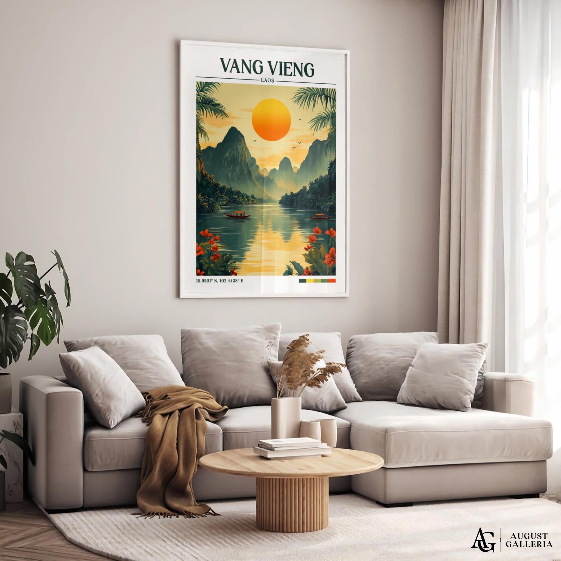 Step into the serene beauty of Vang Vieng with this retro travel illustration, showcasing the town nestled along the Nam Song River and framed by striking limestone karst mountains. Lush greenery and tranquil waters create a sense of calm, while traditional buildings dot the riverside landscape. This print captures the timeless charm, natural splendor, and peaceful atmosphere of Vang Vieng, making it a perfect keepsake for admirers of Laos’ stunning landscapes.