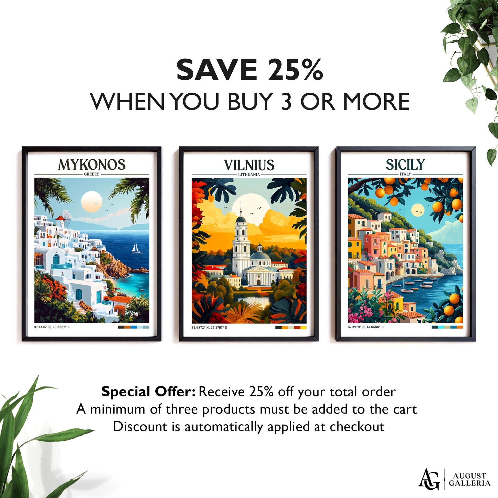 Celebrate the character of Vilnius with this retro-inspired travel print. The artwork centers on the iconic Gediminas’ Tower, standing proudly above the old town. Framed by green hills and the winding Neris River, the scene reflects the mix of history, culture, and natural beauty that defines Lithuania’s capital.